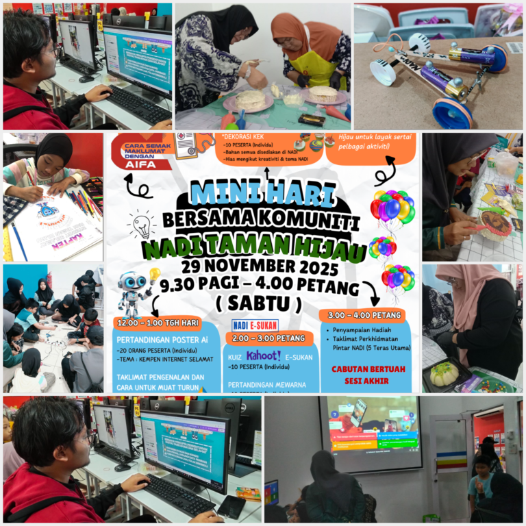 Tarikh : 29 November 2025 Masa : 9.30 – 4.00 ptg Lokasi : NADI Taman Hijau Peserta : 70 orang Tujuan Memberi pendedahan pada komuniti dengan pelbagai perkhidmatan pintar di NADI. Aktiviti Petugas NADI membantu para peserta membuat pendaftaran & […]