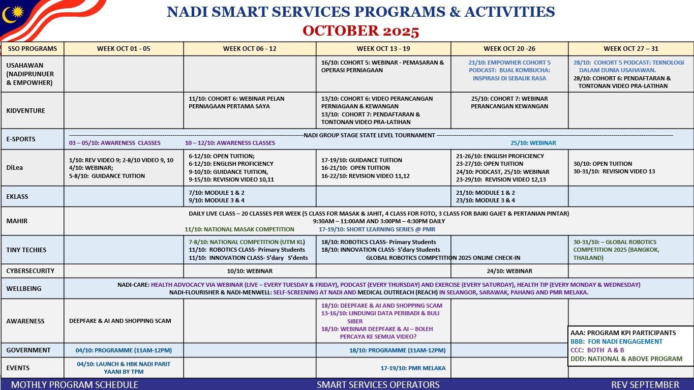 Tarikh : 19 & 25 September 2025 Masa : 9.30 – 3.00 ptg Lokasi : NADI Taman Hijau Peserta : 2 orang Tujuan Membantu melancarkan proses kelas secara atas talian pada komuniti yang telah berdaftar sebagai peserta NADI Mahir Masak […]
